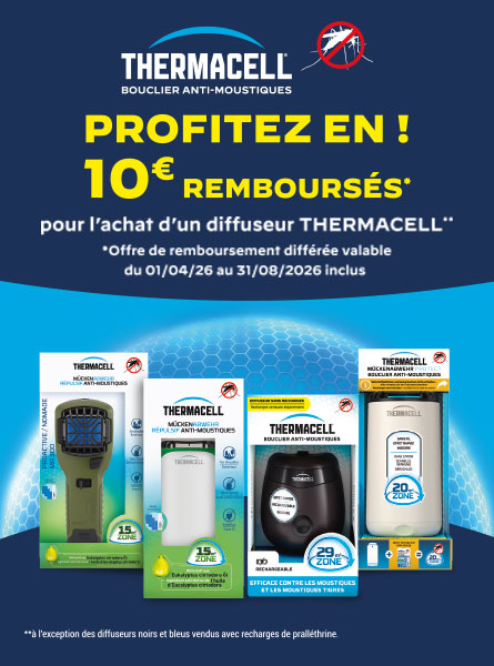 Pour l'achat d'un diffuseur THERMACELL parmis les références éligibles, bénéficiez de 10€ remboursés.