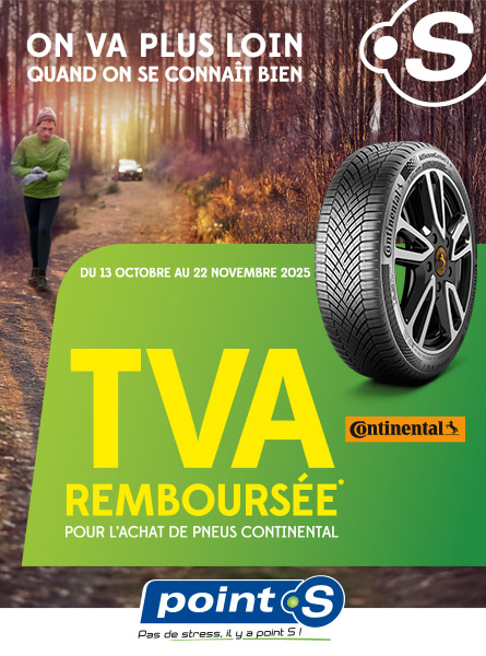 Vous venez d’acheter et de monter 2 ou 4 pneus CONTINENTAL dans l’un des Point S en France ? A cette occasion, Point S vous rembourse la TVA sur vos pneus CONTINENTAL par virement bancaire. Et vous permet de participer automatiquement au tirage au sort pour gagner une carte U de 150€.