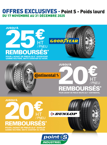 Vous venez d’acheter des pneumatiques de la marque MICHELIN, dans l’un des Point S POIDS LOURD en France ? A cette occasion, Point S vous rembourse jusqu'à 20 HT par pneu achetés, par virement bancaire.